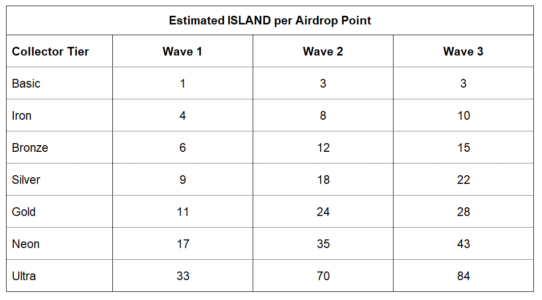 The table below shows the estimated amount of **ISLAND earned per Airdrop Point** for each **Collector Tier** across each wave. Higher Collector Tiers earn ISLAND at a higher rate, and rewards increase with each subsequent wave. The nonlinear increases between Collector Tiers in the same wave are a result of the number of players in the Tier and their relative activity.