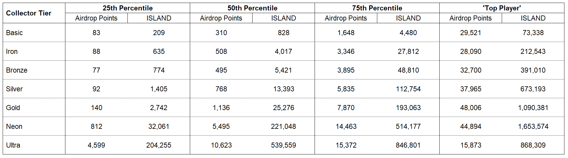 The second table below outlines the **total Airdrop Points for each Collector Tier across all waves combined**, broken down by percentile rankings (25th, 50th, 75th, and 'Top Player'). Each column shows the combined Airdrop Points earned to date as well as the corresponding ISLAND allocations. As noted, these values will increase as Wave 3 progresses, so the numbers below will change.